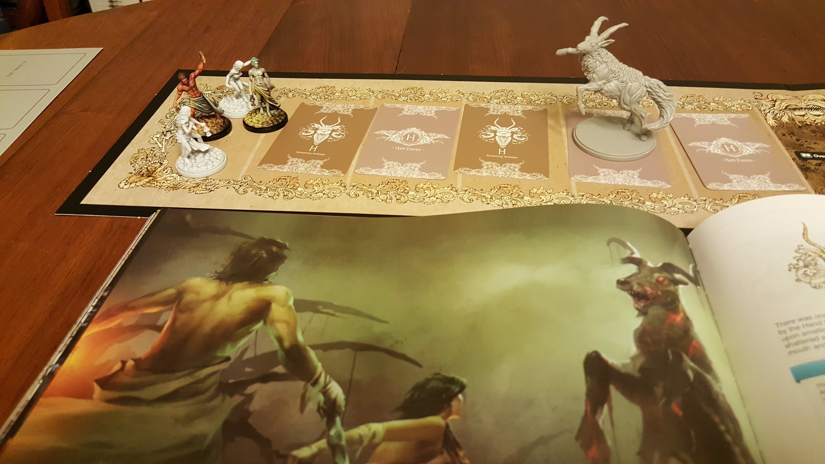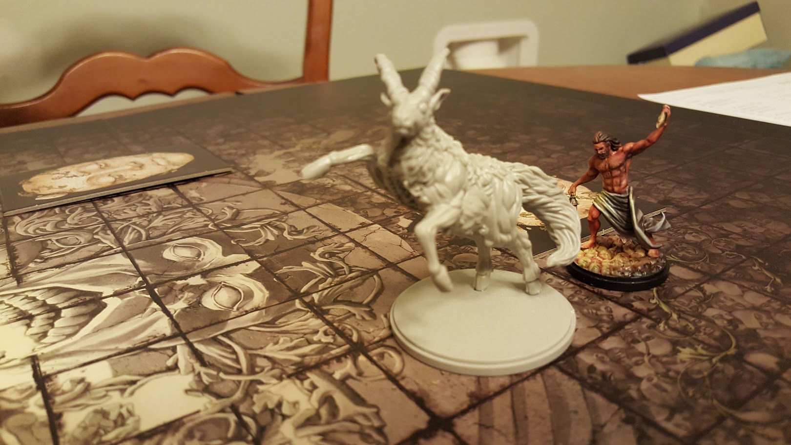 Cullen moves into the Antelope’s blind spot, but cannot land an attack with his one die. Hokk moves his way around the giant stone face in his path.