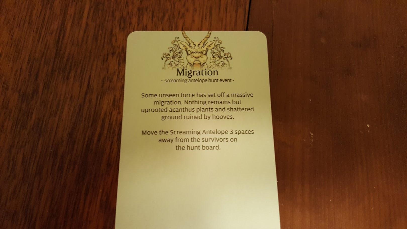 Ugh. The Antelope moves further away, meaning the party now has to endure more Hunt events to reach it, including passing over the Overwhelming Darkness space, a first for our civilization. They move to the second space, a regular hunt event, and roll a 24 on the Hunt Events table: Food from the Mouths of Others.