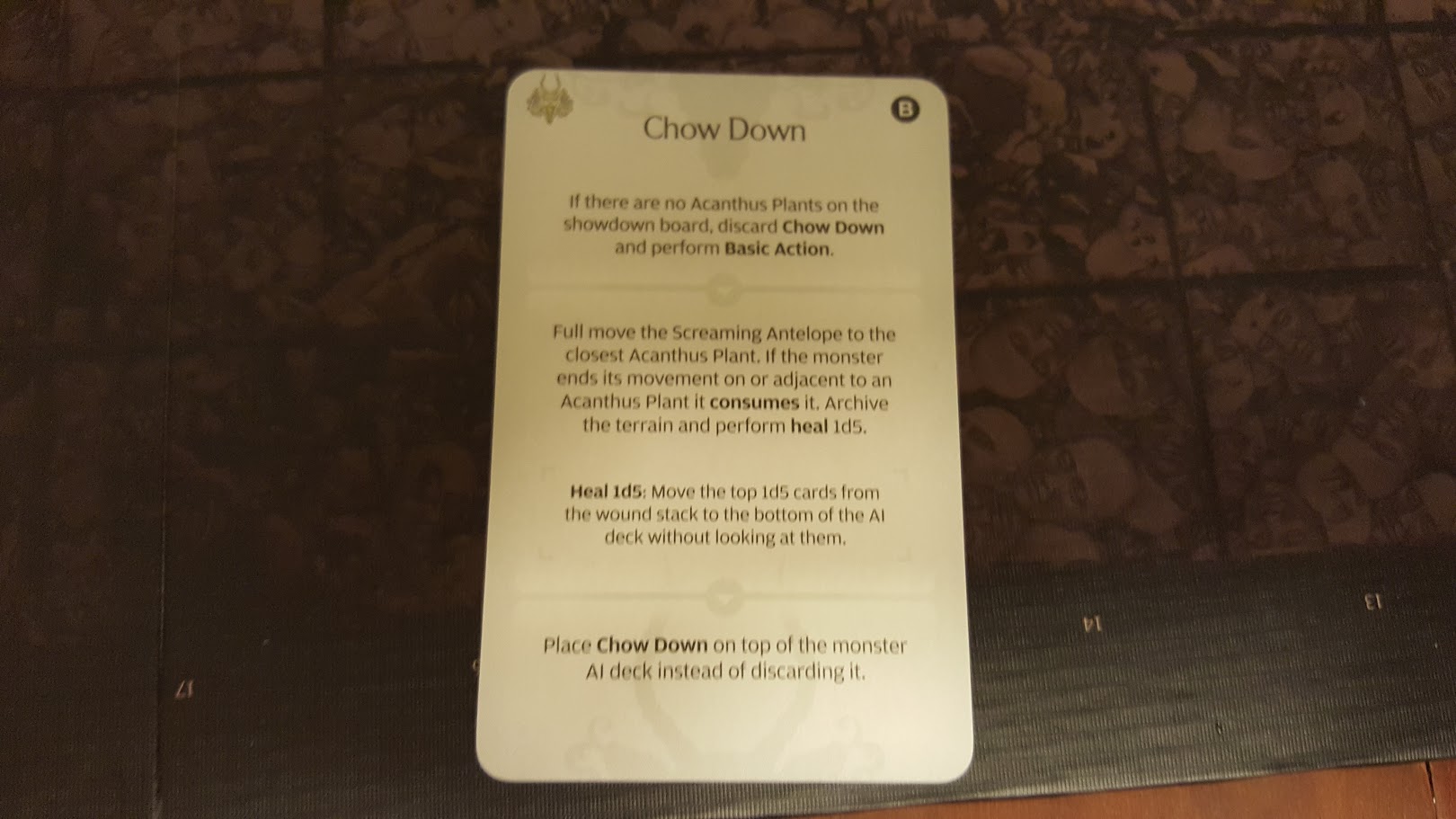 The Antelope draws Chow Down, moving to a nearby plant and eating it. It heals 1 wound. Chow Down is placed on top of the AI pile, to be drawn again next round. Cullen stands at the end of the beast’s turn.