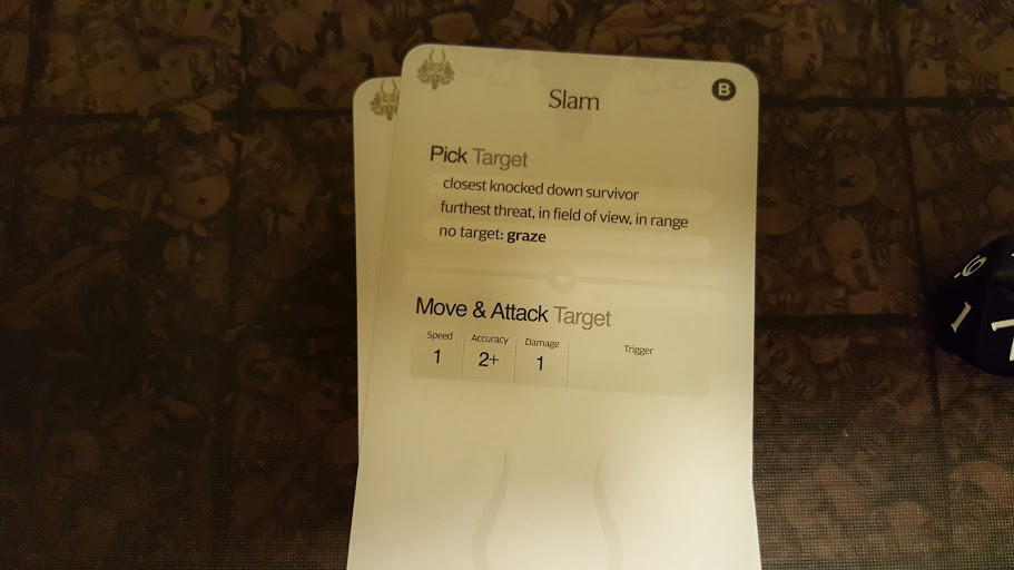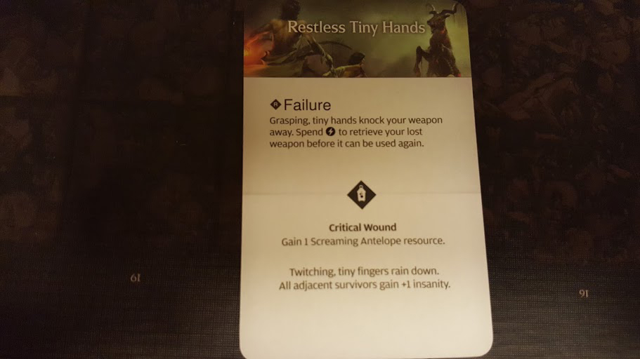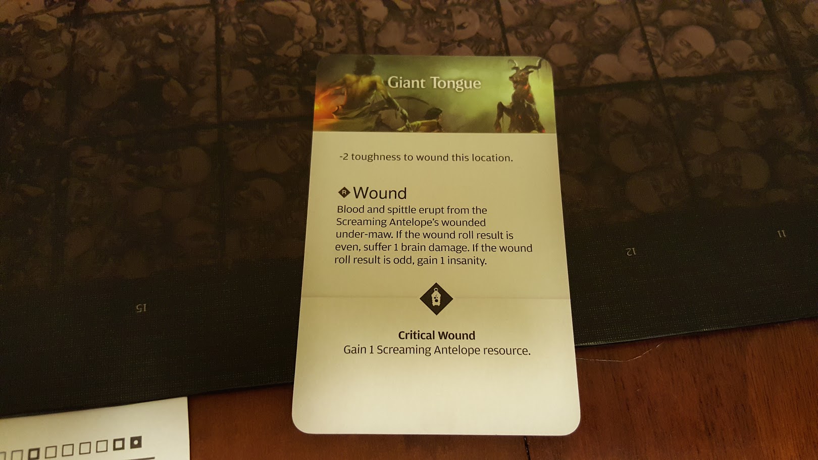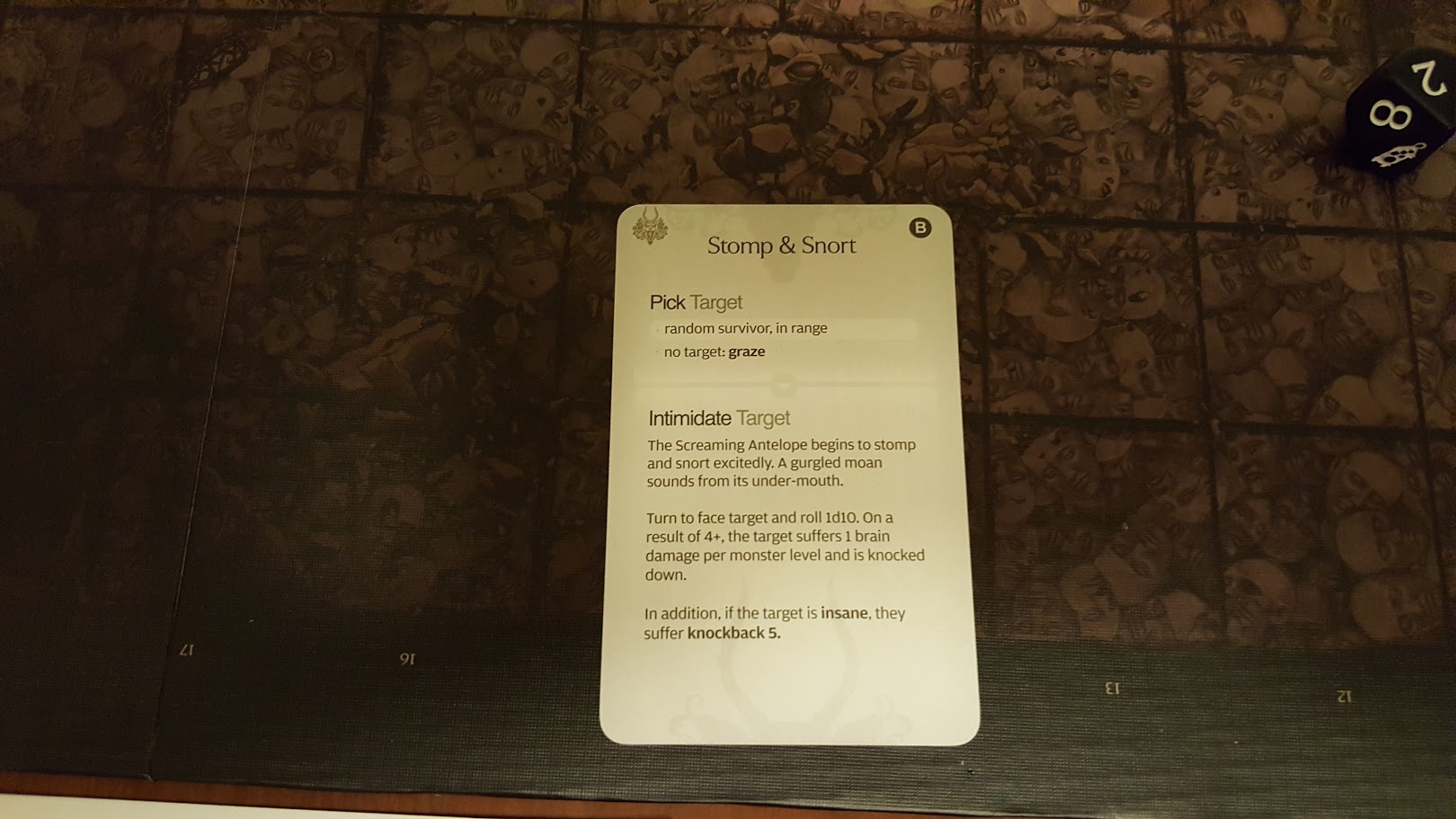 The Antelope Stomps and Snorts. Cullen is knocked down, and suffers brain trauma which gains him 3 insanity. As the hunter is knocked down, the Antelope goes again, drawing Back Kick. The severe damage to his body collapses Cullen’s lung. He gains a bleeding token, and -1 movement due to being unable to catch his breath. Defiant, Cullen stands up.