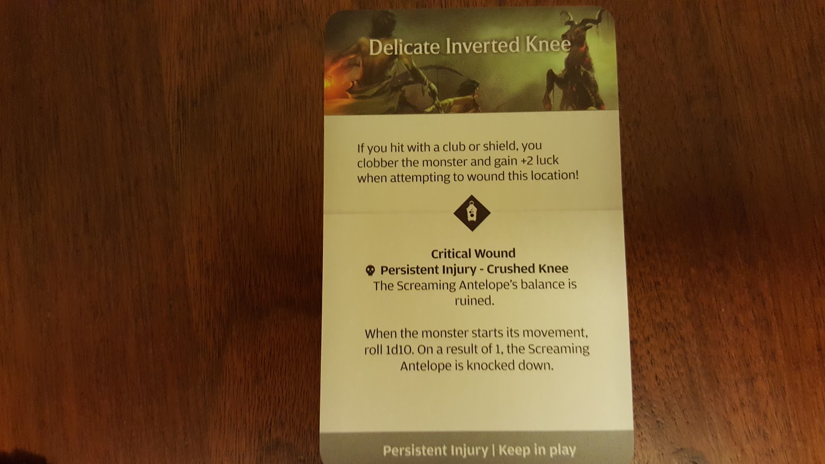 The Antelope draws the only AI card left to it… Back Kick. 3 damage to Cullen’s arms. He is knocked down and suffers Contracture, -1 accuracy and another bleeding token. The monster draws Back Kick again, determined to finish off its foe. The attack dismembers one of Cullen’s arms, gaining him his fifth and final bleeding token.
