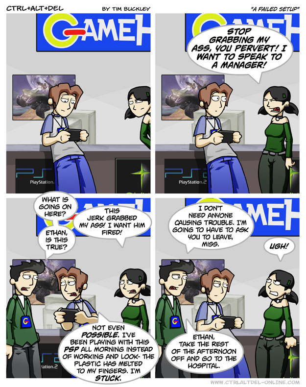 First Previous Random Next Last | 10 Share You are currently browsing the archive for Ctrl Alt Del First Previous Archive Random Next Last | 10 Share Tweet 24 A failed setup April 4, 2005 by Tim Subscribe Notify of new follow-up comments new replies to my comments Label {} [+] Name* Email* Δ Label {} [+] Name* Email* Δ 10 Comments Oldest Newest Most Voted Inline Feedbacks View all comments Cora 7 years ago Ugh! Who does that??? Women suck – and this is coming from a woman herself. 🙂 Random guy 7 years ago Reply to Cora Have you seen last 5 comics? douglas 5 years ago Reply to Cora this reminds me of when i said i hate whities at a buisness party… as a white man Shawn 5 years ago Reply to Cora Cold you believe it’s only gotten worse in the two years since this comment? Intrepyd45 4 years ago Reply to Shawn You were there for 2020, you know we can all believe it GUNnibal 4 years ago Reply to Shawn I dearly wish I couldn’t… Joystick 7 years ago ^ | This… This is why America has problems. Joystick 7 years ago Reply to Joystick @Cora Hmmmhmm 5 years ago Funny how the people who want to avoid drama are the ones causing drama the most. Never trust a snarky woman… Taylor 4 years ago Reply to Hmmmhmm She’s probably the type of girl who has “If you can’t handle me at my worst, you don’t deserve me at my best” tattooed on her.