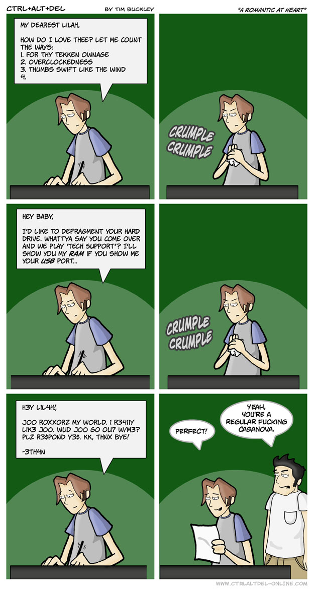 First Previous Random Next Last | 2 Share You are currently browsing the archive for Ctrl Alt Del First Previous Archive Random Next Last | 2 Share Tweet 24 A romantic at heart January 21, 2003 by Tim Subscribe Notify of new follow-up comments new replies to my comments Label {} [+] Name* Email* Δ Label {} [+] Name* Email* Δ 2 Comments Oldest Newest Most Voted Inline Feedbacks View all comments Kasaix 1 year ago Ah, 1337 speak. I wonder if people still unironically use 1337 speak today. princessrosalina 26 days ago count the ways..?? FNAF MENTIONED
