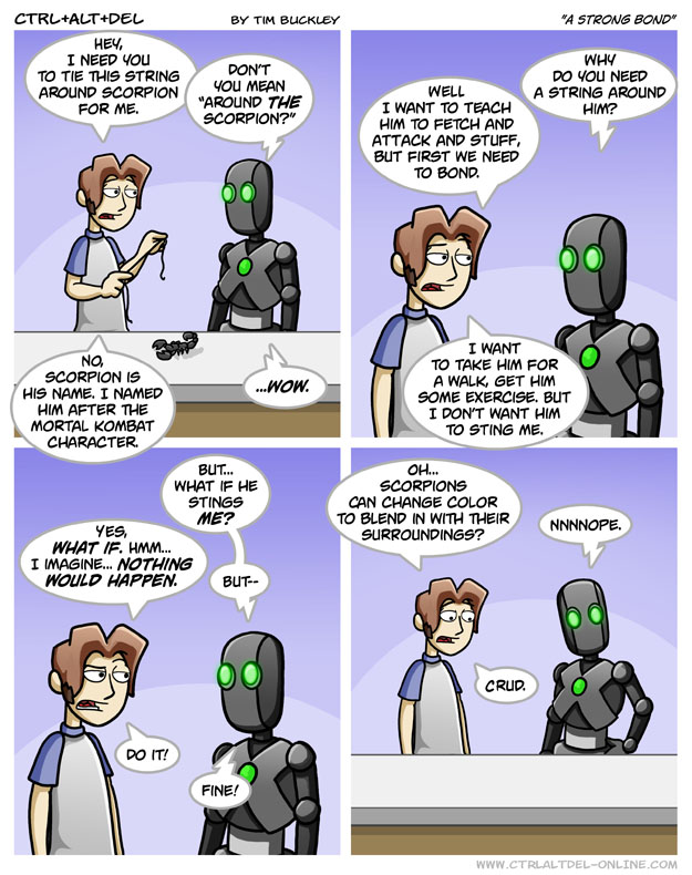 First Previous Random Next Last | 1 Share You are currently browsing the archive for Ctrl Alt Del First Previous Archive Random Next Last | 1 Share Tweet 24 A strong bond August 4, 2007 by Tim Subscribe Notify of new follow-up comments new replies to my comments Label {} [+] Name* Email* Δ Label {} [+] Name* Email* Δ 1 Comment Oldest Newest Most Voted Inline Feedbacks View all comments Reaper 5 years ago Naming your Scorpion… Scorpion, Wow, Genius!