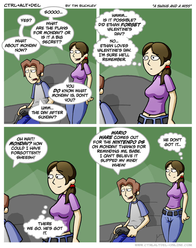 First Previous Random Next Last | 1 Share You are currently browsing the archive for Ctrl Alt Del First Previous Archive Random Next Last | 1 Share Tweet 24 A swing and a miss February 11, 2005 by Tim Subscribe Notify of new follow-up comments new replies to my comments Label {} [+] Name* Email* Δ Label {} [+] Name* Email* Δ 1 Comment Oldest Newest Most Voted Inline Feedbacks View all comments MidnightDStroyer 7 years ago And as long as Ethan keeps forgetting events like Valentine’s Day, he’s probably never going to “get it.”
