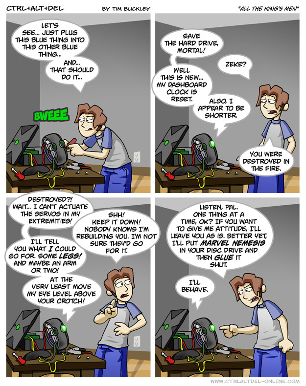 First Previous Random Next Last | 1 Share You are currently browsing the archive for Ctrl Alt Del First Previous Archive Random Next Last | 1 Share Tweet 24 All the king’s men September 30, 2005 by Tim Subscribe Notify of new follow-up comments new replies to my comments Label {} [+] Name* Email* Δ Label {} [+] Name* Email* Δ 1 Comment Oldest Newest Most Voted Inline Feedbacks View all comments Him. 7 years ago “All the king’s dirtbikes and all the king’s men Still couldn’t get Zeke back together again because that’s the wrong universe. Sorry.”
