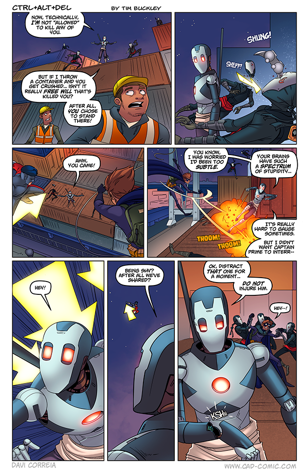 I’m pretty sure that this is a tongue-in-cheek joke of Zeke’s. I don’t think the sociopath who is behind the Red Ring Clan said, while programming hin, “You know what would go great with my ninja death robot? Asimov’s three laws of robotics! That would make sure that it has regard for human life and obeys any orders that any person gives it.”