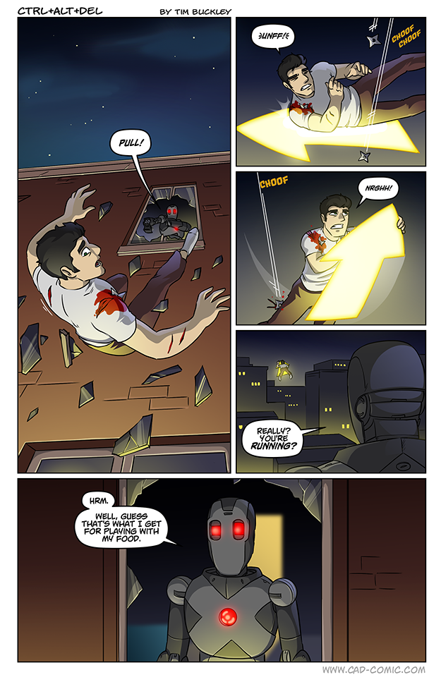 Well, he is forced into service (as per his own words, the guy giving him orders has a kill switch – well, unless he was lying), so I think it’s quite possible he’d be doing something else if free (though not necessarily become a “good guy”). In previous strip someone commented, that he could be in fact intentionally sabotaging his kill of Lucas, pretending to fail, as his master is probably remotely watching everything that happens through some camera built into Zeke – I think it’d make sense and is possible.