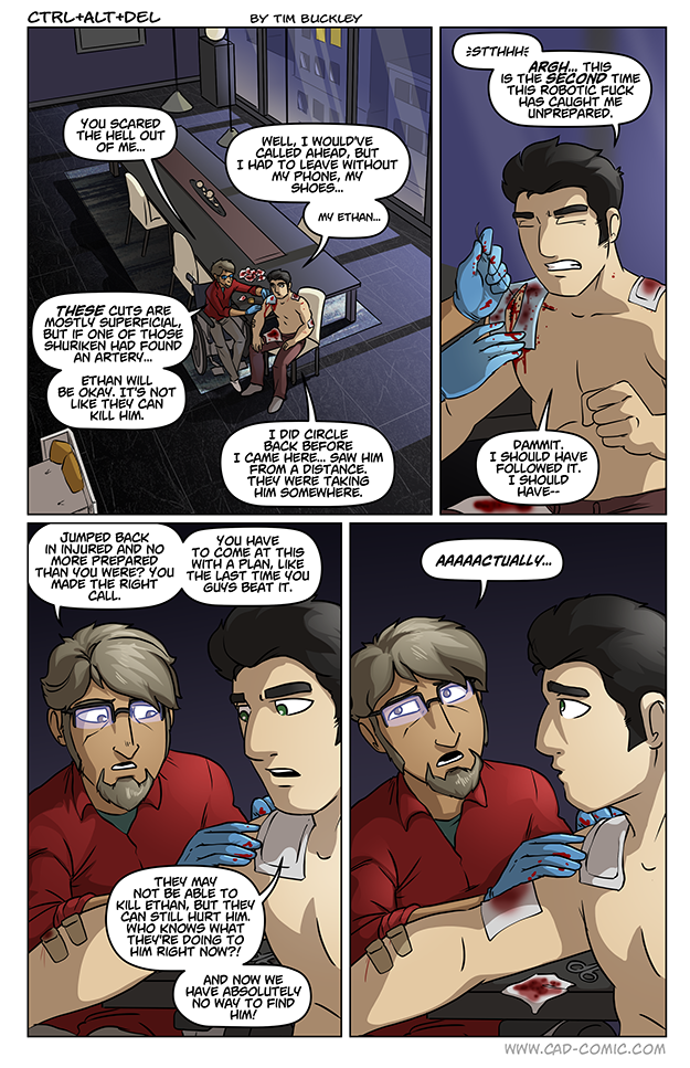 Makes me wonder why the robot’s boss, for all of his preparedness, didn’t think to look through the entire network of people connected to Lucas and Ethan, rather than just attempt a direct ambush on their home turf. He should know they own Gamehaven, and would thus know that Scott works there, unless he’s only employed off the books (which he may well be; we don’t know for sure). Still, you’d think the mastermind would have scoped it out via camera or something to identify a pattern, such as the dude in the wheelchair who was always around.
