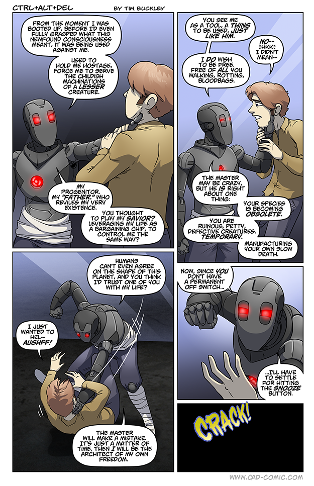 Yay! No hackneyed, overdone cliches here! The robot who hates humanity STILL hates humanity! He’s right, even if Ethan doesn\t realize it, he WAS trying to use Zeke.