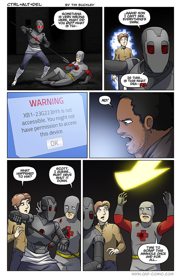 Yeah, it seems likely that Ethan is going to stop this, and that would definitely be a mistake. Major props to Scott for his skillz, but these two don’t know what’s happening and are definitely still in danger. Cutting the robot in half will eliminate the immediate threat and it wouldn’t be fatal, nor even necessarily permanent.