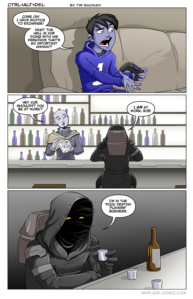 First Previous Random Next Last | 2 Share You are currently browsing the archive for Ctrl Alt Del First Previous Archive Random Next Last | 2 Share Tweet 24 And business is good December 15, 2014 by Tim Subscribe Notify of new follow-up comments new replies to my comments Label {} [+] Name* Email* Δ Label {} [+] Name* Email* Δ 2 Comments Oldest Newest Most Voted Inline Feedbacks View all comments MidnightDStroyer 7 years ago So, that’s the job that Xur took after betraying the Star League to the Kodon Armada, huh? ColaSkunky 7 years ago Reply to MidnightDStroyer I get that reference and it makes me so happy that I do.