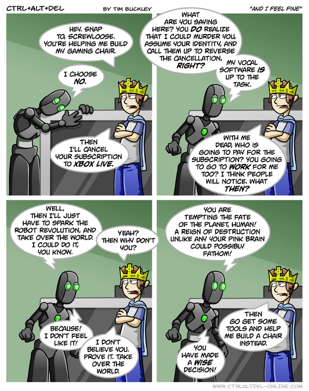 First Previous Random Next Last | 3 Share You are currently browsing the archive for Ctrl Alt Del First Previous Archive Random Next Last | 3 Share Tweet 24 And I feel fine January 8, 2007 by Tim Subscribe Notify of new follow-up comments new replies to my comments Label {} [+] Name* Email* Δ Label {} [+] Name* Email* Δ 3 Comments Oldest Newest Most Voted Inline Feedbacks View all comments Hamstermer 7 years ago It’s so nice that Zeke is helping completely of his own free will and is not being tricked or brought through assorted logical hoops. Doctor Disaster 5 years ago Zeke wouldn’t even make it past the Captcha. El Guero Caliente 4 years ago Reply to Doctor Disaster ^^ This comment should be +1,000,000 by now!