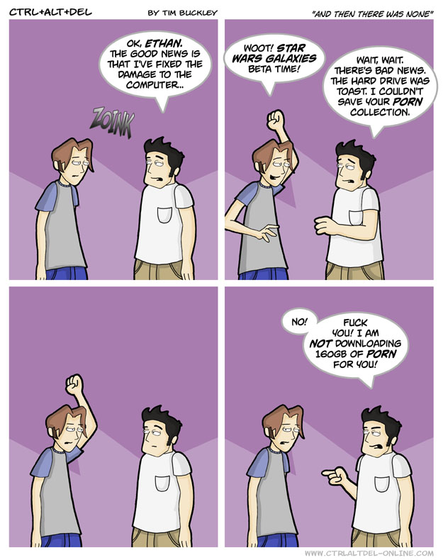 First Previous Random Next Last | 4 Share You are currently browsing the archive for Ctrl Alt Del First Previous Archive Random Next Last | 4 Share Tweet 24 And then there was none January 3, 2003 by Tim Subscribe Notify of new follow-up comments new replies to my comments Label {} [+] Name* Email* Δ Label {} [+] Name* Email* Δ 4 Comments Oldest Newest Most Voted Inline Feedbacks View all comments DonnyDaGoblin 5 years ago HAHAHAHAHHAAHAHHAHAHAHAHAHHAHAHAHHAHAHHAHA!!! dragonman9001 5 years ago 160 GB? That’s definitely a sign you’re addicted. tipofthetop 4 years ago Reply to dragonman9001 160 GB is completely normal. Maxwell 3 years ago Reply to tipofthetop You’re talking about 2022 tech standards, back at 2003 HAVING a storage over 100GB was seen as awesome, not to mention the horrible download speeds 😀