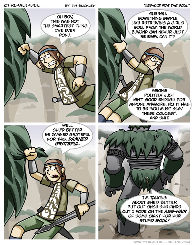 First Previous Random Next Last | 4 Share You are currently browsing the archive for Ctrl Alt Del First Previous Archive Random Next Last | 4 Share Tweet 24 Ass-hair for the soul October 31, 2005 by Tim Subscribe Notify of new follow-up comments new replies to my comments Label {} [+] Name* Email* Δ Label {} [+] Name* Email* Δ 4 Comments Oldest Newest Most Voted Inline Feedbacks View all comments Kokimichi 7 years ago To this day, this is still one of my favorite games. Kaz 4 years ago What game is this? PuppiesOnAcid 4 years ago Reply to Kaz Shadow of the Colossus Puppies_On_Acid 4 years ago Reply to Kaz Shadow of the Colossus