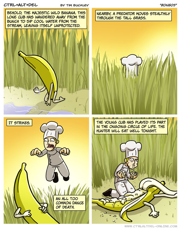 First Previous Random Next Last | 2 Share You are currently browsing the archive for Ctrl Alt Del First Previous Archive Random Next Last | 2 Share Tweet 24 Bongos September 1, 2007 by Tim Subscribe Notify of new follow-up comments new replies to my comments Label {} [+] Name* Email* Δ Label {} [+] Name* Email* Δ 2 Comments Oldest Newest Most Voted Inline Feedbacks View all comments El Guero Caliente 4 years ago I don’t think I’ve ever been grossed out by a banana until this moment. ….buuuut, I do like that at least this comic made sense… probably because he didn’t actually say anything. Jay 2 months ago I read this in David Attenborough’s voice.