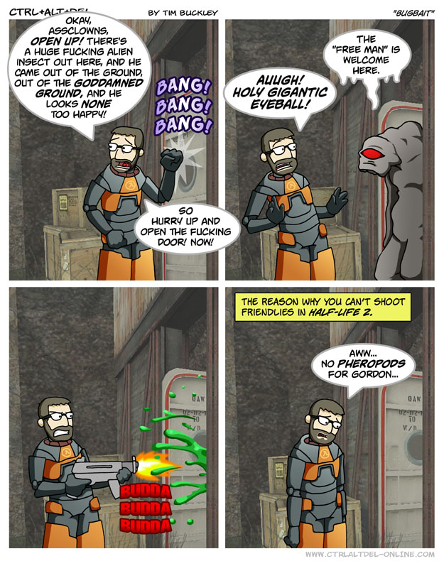 First Previous Random Next Last | 2 Share You are currently browsing the archive for Ctrl Alt Del First Previous Archive Random Next Last | 2 Share Tweet 24 Bugbait December 13, 2004 by Tim Subscribe Notify of new follow-up comments new replies to my comments Label {} [+] Name* Email* Δ Label {} [+] Name* Email* Δ 2 Comments Oldest Newest Most Voted Inline Feedbacks View all comments Hamstermer 8 years ago Well, it is an eyeball. And it is gigantic. The guy’s also the equivalent of a priest in his culture. jtkblue 3 years ago you can kill the vorts in hl1, i tried to shoot at it at this part in hl2 lol