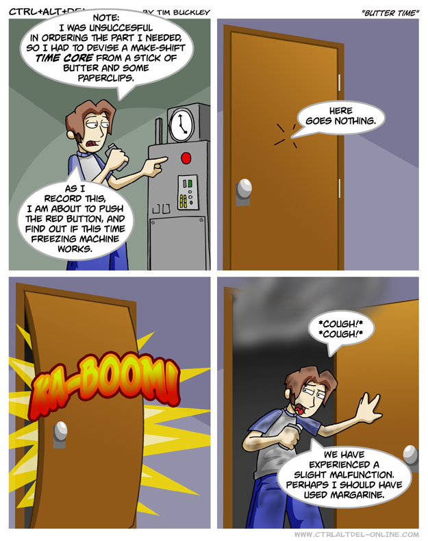 First Previous Random Next Last | 2 Share You are currently browsing the archive for Ctrl Alt Del First Previous Archive Random Next Last | 2 Share Tweet 24 Butter time November 22, 2004 by Tim Subscribe Notify of new follow-up comments new replies to my comments Label {} [+] Name* Email* Δ Label {} [+] Name* Email* Δ 2 Comments Oldest Newest Most Voted Inline Feedbacks View all comments Arceus 7 years ago He decided to substitute the flux capacitor…. NEVER SUBSTITUTE THE FLUX CAPACITOR TIM THE TAT MAN 5 years ago Reply to Arceus yeah you should never ever substitute the flux capacitor