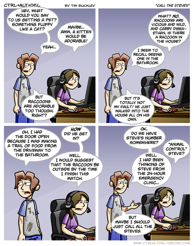 First Previous Random Next Last | 3 Share You are currently browsing the archive for Ctrl Alt Del First Previous Archive Random Next Last | 3 Share Tweet 24 Call the steves October 27, 2007 by Tim Subscribe Notify of new follow-up comments new replies to my comments Label {} [+] Name* Email* Δ Label {} [+] Name* Email* Δ 3 Comments Oldest Newest Most Voted Inline Feedbacks View all comments Hamstermer 8 years ago BRING ALL THE THINGS CALL ALL THE STEVES 10 minutes later… “Hello? Steve?” “This is Steve’s Stonecold Strawberries” “Hey man what’s up? I just got attacked by a racoon” douglas 5 years ago Reply to Hamstermer i miss my pet named steve… ill leet myself out now Maximum 3 years ago Minecraft mobs are mobbing Minecraft mobs is what auto-correct said when I typed mine. Also, MINECRAFT STEVE IS HERE! I need help with a racc- slice!
