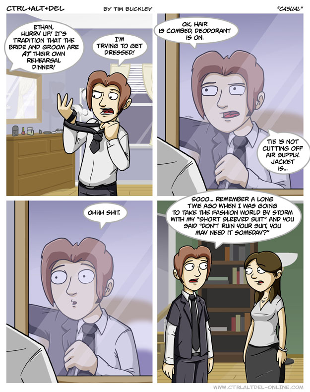 First Previous Random Next Last | 1 Share You are currently browsing the archive for Ctrl Alt Del First Previous Archive Random Next Last | 1 Share Tweet 24 Casual November 20, 2009 by Tim Subscribe Notify of new follow-up comments new replies to my comments Label {} [+] Name* Email* Δ Label {} [+] Name* Email* Δ 1 Comment Oldest Newest Most Voted Inline Feedbacks View all comments eekee 4 years ago Ties! I’ve worn them all my life and yet… Oh no… no no no that suit… Last minute CLOTHES PANICS are another thing I’ve had all my life… *thousand-yard stare*