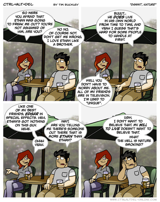 First Previous Random Next Last | 3 Share You are currently browsing the archive for Ctrl Alt Del First Previous Archive Random Next Last | 3 Share Tweet 24 Dammit, nature May 28, 2007 by Tim Subscribe Notify of new follow-up comments new replies to my comments Label {} [+] Name* Email* Δ Label {} [+] Name* Email* Δ 3 Comments Oldest Newest Most Voted Inline Feedbacks View all comments Human #27 6 years ago Now I want to see what Edgar is up to Stacts 2 years ago Reply to Human #27 I’ve got the brain-bleach ready for when you do. That one n00b 1 year ago Two comments I want to make; 1: Chef Brian’s first name is Edgar? 2: I kinda want them to meet each other and either work together on a project, or have some kind of competition.