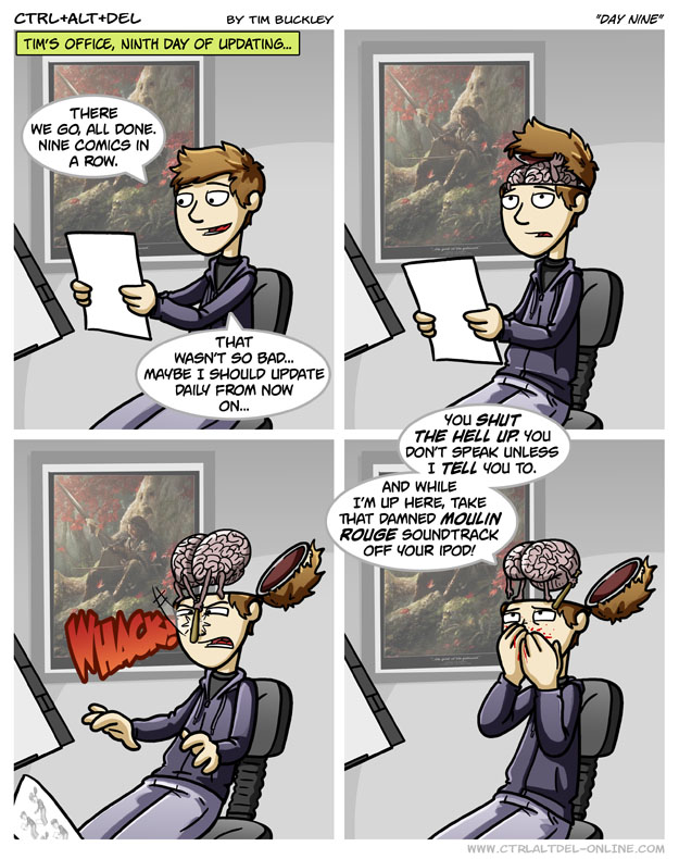 First Previous Random Next Last | 3 Share You are currently browsing the archive for Ctrl Alt Del First Previous Archive Random Next Last | 3 Share Tweet 24 Day nine February 2, 2008 by Tim Subscribe Notify of new follow-up comments new replies to my comments Label {} [+] Name* Email* Δ Label {} [+] Name* Email* Δ 3 Comments Oldest Newest Most Voted Inline Feedbacks View all comments robbie 7 years ago the comic that he drops is this comic, though the panels seems to be out of order. douglas 5 years ago Reply to robbie i appricieate all of the little jokes in hese comics Saixak 1 year ago Reply to robbie I must have passed by this strip dozens of times through the years, and that’s the first time I ever noticed that detail. Nice catch.