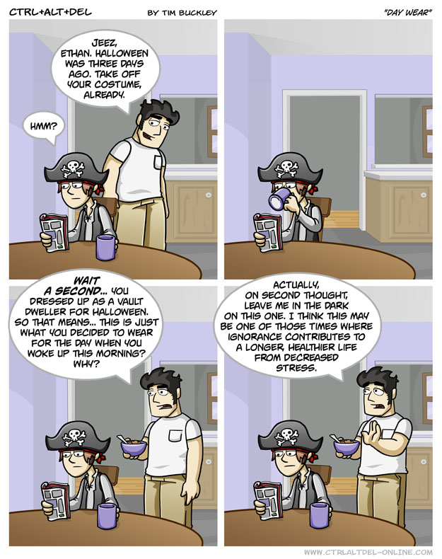 First Previous Random Next Last | 2 Share You are currently browsing the archive for Ctrl Alt Del First Previous Archive Random Next Last | 2 Share Tweet 24 Day wear November 3, 2007 by Tim Subscribe Notify of new follow-up comments new replies to my comments Label {} [+] Name* Email* Δ Label {} [+] Name* Email* Δ 2 Comments Oldest Newest Most Voted Inline Feedbacks View all comments Somewhere 7 years ago Honestly it was all he had left in his drawer. It WAS laundry day after all. Poe-Etic 5 years ago As a blood born pirate, I commend you, Ethan.