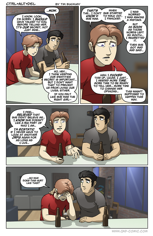 I think this might be the single most potent strip in all the years I’ve followed CAD. It’s strength is it gets the emotional point across with the art (which has improved over time), the paucity of pretense, and the simplicity of Ethan’s thoughts and feelings which convey his conflict and sincere hurt without having to overdo the presentation. That’s a fine grade of maturity in story design, Tim. Also, the fact Lucas is really there for him rings true to most of my similar experiences. There’s always one or two friends willing to listen to you, not try to… Read more »