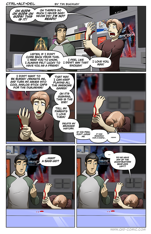 I know this is intended to be over the top, but as someone who sliced my hand just like that last summer, that’s not just a Bandaid cut. That’s a butterfly stitches and a tetanus shot cut. *shudders*