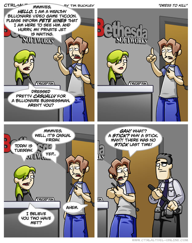 First Previous Random Next Last | 1 Share You are currently browsing the archive for Ctrl Alt Del First Previous Archive Random Next Last | 1 Share Tweet 24 Dress to kill March 11, 2006 by Tim Subscribe Notify of new follow-up comments new replies to my comments Label {} [+] Name* Email* Δ Label {} [+] Name* Email* Δ 1 Comment Oldest Newest Most Voted Inline Feedbacks View all comments Somewhere 7 years ago All you need are the first two panels. Nothing else.