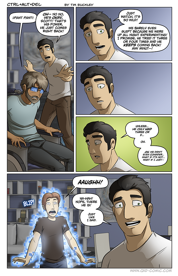 This may have been discussed in previous strips, but the possible connection just clicked for me. Powers often have some relation to the person’s history (they’re gamers, they were gaming – hence gaming related powers). But more than that – did Lucas get directionally based powers because he kind of manages/directs Ethan? And did Ethan get the ability to respawn because of an intense wish that Carly could come back?