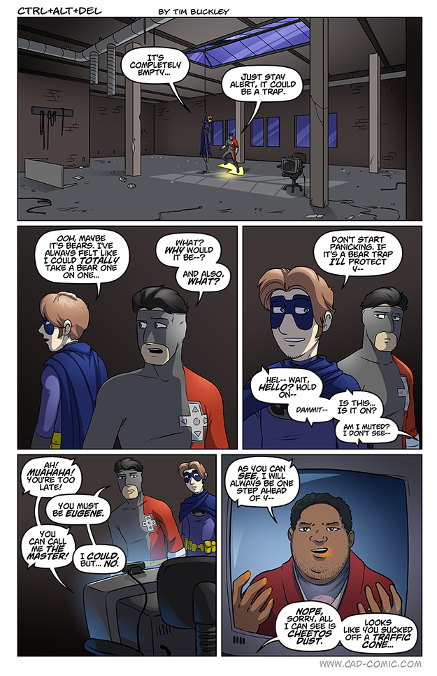 Upon review, I’m very concerned about one thing. If that’s the TV from the first panel, the wire doesn’t appear to be plugged into anything. Superpowers, or just not enough resolution to see a place it plugs into the floor?