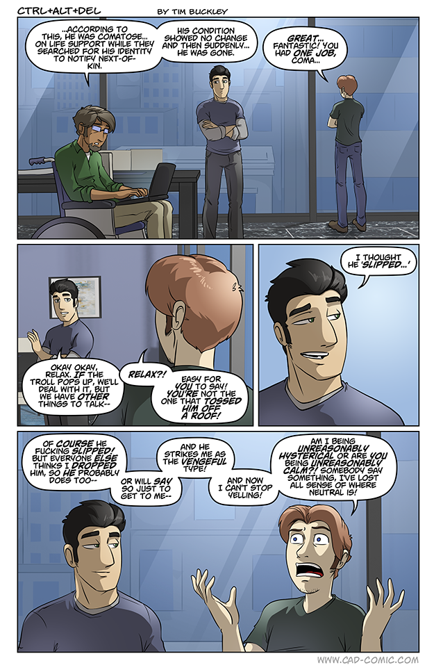 I’m not sure about that. Lucas and Ethan are on completely different wavelengths here, and I don’t think that Ethan really *gets* what Lucas is worried about. I think Lucas is just being patient. Back on p5, when Ethan asks nonchalantly “What do we do now?” Lucas is far more serious. “I don’t… there’s only one thing we can do, but…” and then, cut off. And now here, “We have other things to talk-” and again, cut off. Eugene’s got their identities, has threatened to expose them to the world, and potentially now has leverage to force THEM to act… Read more »