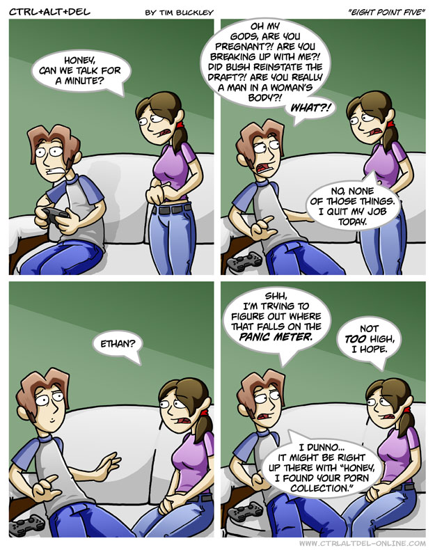 First Previous Random Next Last | 2 Share You are currently browsing the archive for Ctrl Alt Del First Previous Archive Random Next Last | 2 Share Tweet 24 Eight point five November 27, 2006 by Tim Subscribe Notify of new follow-up comments new replies to my comments Label {} [+] Name* Email* Δ Label {} [+] Name* Email* Δ 2 Comments Oldest Newest Most Voted Inline Feedbacks View all comments Arceus 7 years ago Jusging by the title, that sits pretty high up on the panic-o-meter. goombanatti 4 years ago Reply to Arceus this assumes its a 1-10 scale
