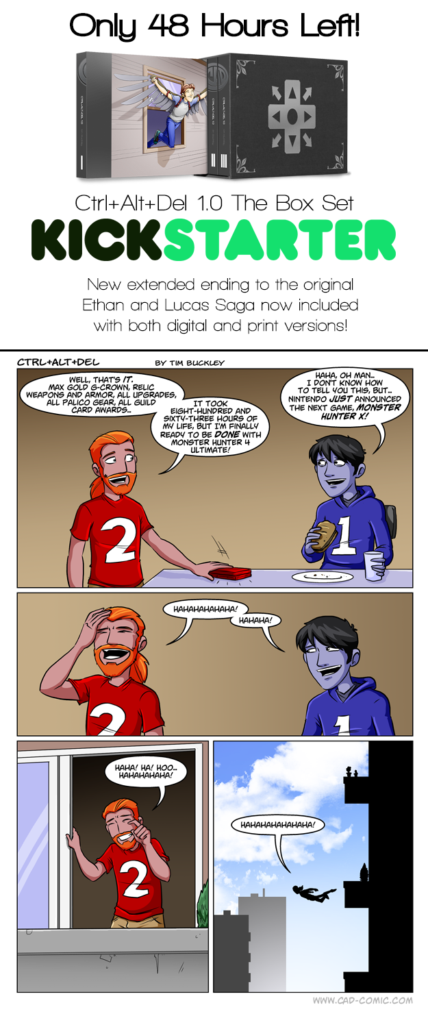 First Previous Random Next Last | 6 Share You are currently browsing the archive for Ctrl Alt Del First Previous Archive Random Next Last | 6 Share Tweet 24 Endless cycle June 1, 2015 by Tim Subscribe Notify of new follow-up comments new replies to my comments Label {} [+] Name* Email* Δ Label {} [+] Name* Email* Δ 6 Comments Oldest Newest Most Voted Inline Feedbacks View all comments Loss 8 years ago I want that box set Sr. Vanilla Milkshake 8 years ago HAHAHA HAHAHAHA HOOO HOO HAHAHA AHAHAHA AHHH *splat* …and then the universe exploded Malcolm McDougal 7 years ago is there any way to either get the box set or see the extended ending? Mr. Man 6 years ago extended ENDING?!?!!? Mike Jacob Warrington 6 years ago Where do I find this extended version. Cant find the digital version Carbo 3 years ago And then monster hunter xx came out. At least you could transfer saves