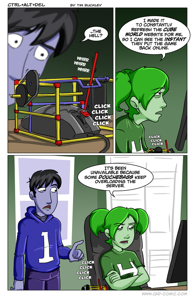 First Previous Random Next Last | 5 Share You are currently browsing the archive for Ctrl Alt Del First Previous Archive Random Next Last | 5 Share Tweet 24 Fanatical July 8, 2013 by Tim Subscribe Notify of new follow-up comments new replies to my comments Label {} [+] Name* Email* Δ Label {} [+] Name* Email* Δ 5 Comments Oldest Newest Most Voted Inline Feedbacks View all comments Somewhere 7 years ago Completely logical Joystick 7 years ago I wonder why Saberhagon 7 years ago I never got a chance to even play that game. Dingleshits McDanglybits 4 years ago To be fair, clicking refresh a lot, while excessive, isn’t going to be enough to crash a whole server… unless that server really sucks. WJS 3 years ago Reply to Dingleshits McDanglybits Also the server hosting the website will not be the same server the game is played on.