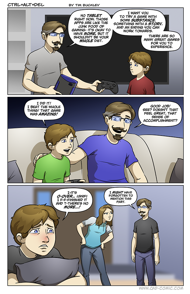 That sadness following finishing a very good game can be educational. Children today are some what pampered (not speaking any one specifically) and get so much attention and adults try to guard them away from negative experiences. Life is full of positive, and negative feelings, and what could be a better way to learn those than a good game which you can discuss of with your parents and friends/siblings after completing it…