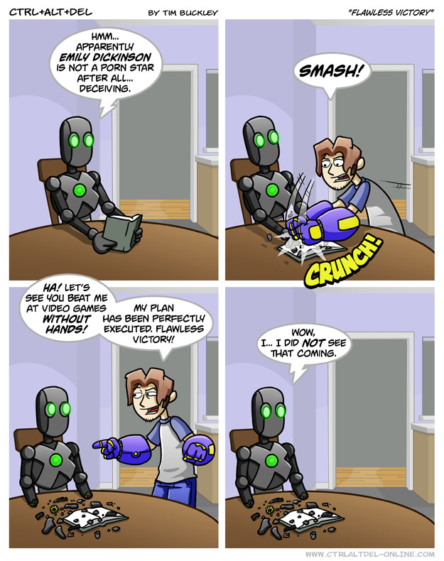 First Previous Random Next Last | 3 Share You are currently browsing the archive for Ctrl Alt Del First Previous Archive Random Next Last | 3 Share Tweet 24 Flawless victory April 14, 2007 by Tim Subscribe Notify of new follow-up comments new replies to my comments Label {} [+] Name* Email* Δ Label {} [+] Name* Email* Δ 3 Comments Oldest Newest Most Voted Inline Feedbacks View all comments jonisnotameme 7 years ago Why do we destroy Zeke’s hands every single chance we get? Doctor Disaster 5 years ago What would make Zeke believe that Emily Dickinson was a pornstar in the first place? Why Can’t I Think of a Name 5 years ago Reply to Doctor Disaster Dick in son?