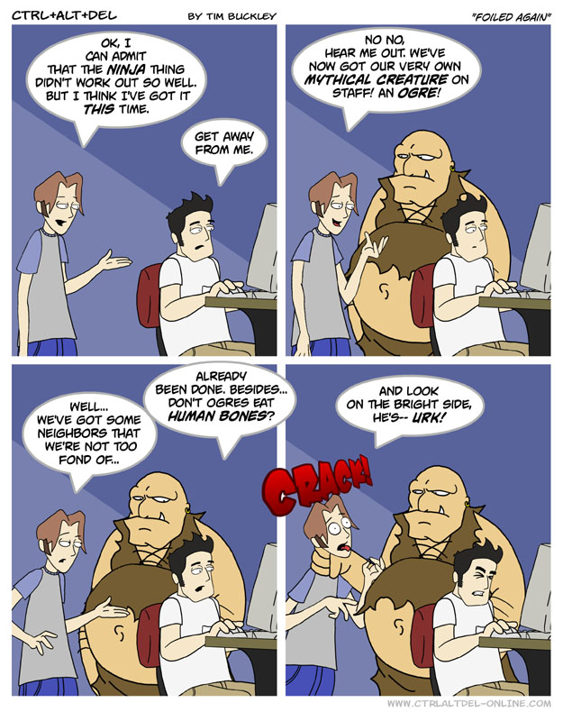 He’s really only there because he needs to pay for his treatment. The ogre has Massive Digestive Tract Disorder (MDTD), and while it is treatable, most doctor’s offices don’t accept the standard currency of Ogres (giant bone shards). The nearest doctor who does lives in Maryland, so the ogre is saving up human money to afford treatment/get a plane to Maryland.