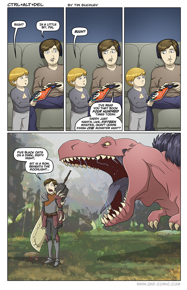Oh my god. That is actually, down to the glare on Panel 3, exactly my life yesterday. Except replace that book with “Hippos Go Beserk!” by Sandra Boynton.