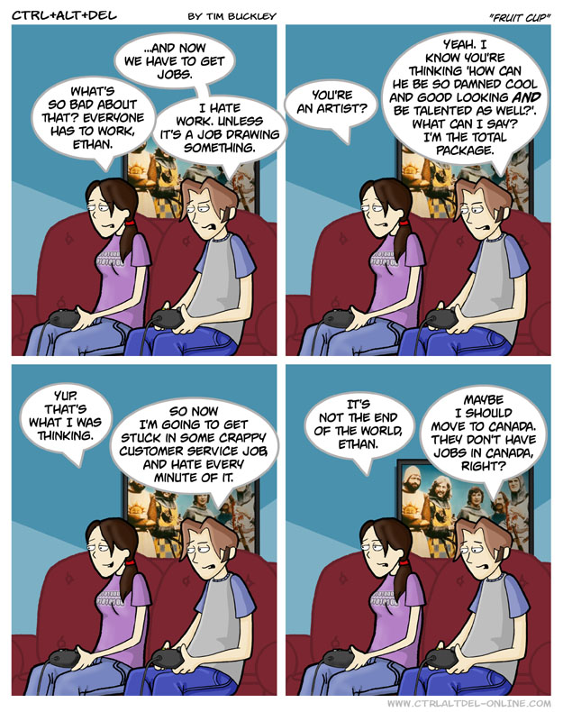 First Previous Random Next Last | 4 Share You are currently browsing the archive for Ctrl Alt Del First Previous Archive Random Next Last | 4 Share Tweet 24 Fruit cup March 14, 2003 by Tim Subscribe Notify of new follow-up comments new replies to my comments Label {} [+] Name* Email* Δ Label {} [+] Name* Email* Δ 4 Comments Oldest Newest Most Voted Inline Feedbacks View all comments Arceus837 7 years ago I hate to break it to you, Ethan, but they do indeed have jobs in Canada. Skilltagz 7 years ago Reply to Arceus837 As a student here in Canada, I hate to say it but we don’t really have jobs here… El Guero Caliente 4 years ago …why is this episode titled “Fruit Cup”? Anonymous 1 month ago Reply to El Guero Caliente Never question the FRUIT CUP