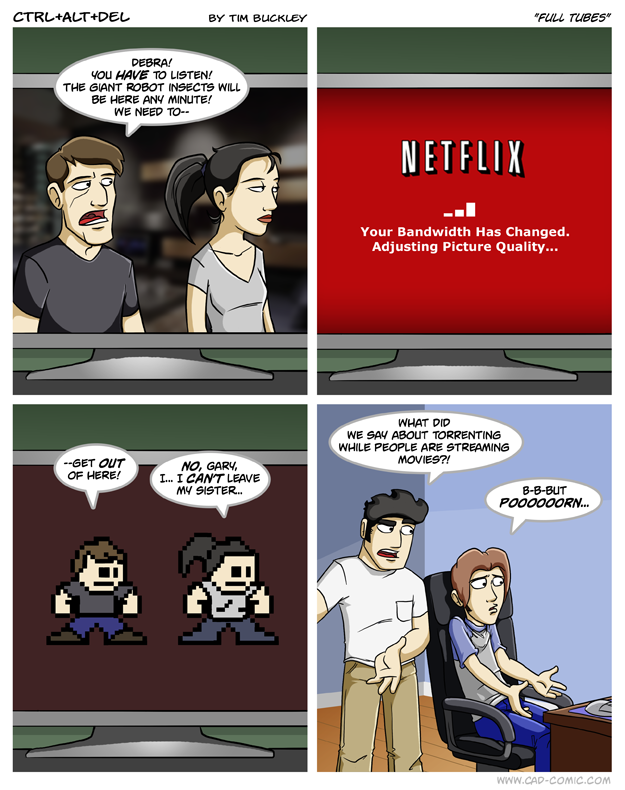 First Previous Random Next Last | 3 Share You are currently browsing the archive for Ctrl Alt Del First Previous Archive Random Next Last | 3 Share Tweet 24 Full tubes May 25, 2011 by Tim Subscribe Notify of new follow-up comments new replies to my comments Label {} [+] Name* Email* Δ Label {} [+] Name* Email* Δ 3 Comments Oldest Newest Most Voted Inline Feedbacks View all comments MidnightDStroyer 7 years ago If Ethan has ragged the bandwidth enough to make his porn download with the same video quality as Netflix went, then what’s the point? o.0 Him. 6 years ago Reply to MidnightDStroyer Maybe Ethan appreciates the 8-bit sprite format…? israel saucedo 5 years ago Reply to MidnightDStroyer His computer is probably connected to the router rather than wirelessly so it probably is soaking up all the connection(from a guy who torrented….stuff while parents were watching netflix)