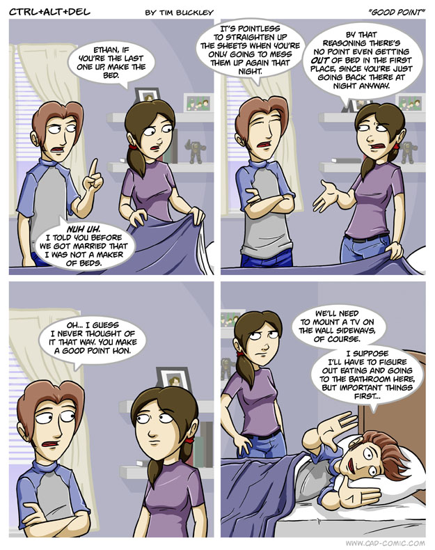 First Previous Random Next Last | 1 Share You are currently browsing the archive for Ctrl Alt Del First Previous Archive Random Next Last | 1 Share Tweet 24 Good point November 12, 2010 by Tim Subscribe Notify of new follow-up comments new replies to my comments Label {} [+] Name* Email* Δ Label {} [+] Name* Email* Δ 1 Comment Oldest Newest Most Voted Inline Feedbacks View all comments Arc 7 years ago I have the same philosophy. Uh, not the staying in bed. I still get up at 2 pm.
