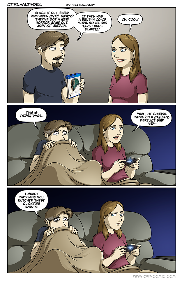 This is like my husband and me, he does like/play some games, but he is not used to a controller so… he refused to keep playing Until Dawn with me, rather just watched me play and help decide. I bought this game yesterday because of this comic, I don’t always keep up with game news, so it was a nice surprise. And read a bit about the co-op, the online co-op sounds interesting too. But I’ve convinced the husbs to play with me again, since the extra settings for press (instead of button smash) and no qte time-out made him… Read more »