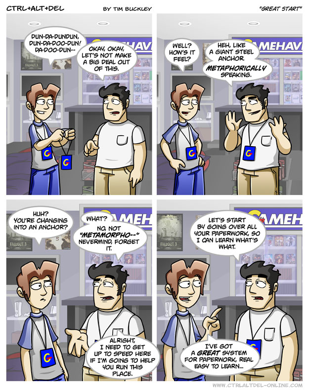 First Previous Random Next Last | 5 Share You are currently browsing the archive for Ctrl Alt Del First Previous Archive Random Next Last | 5 Share Tweet 24 Great start May 11, 2009 by Tim Subscribe Notify of new follow-up comments new replies to my comments Label {} [+] Name* Email* Δ Label {} [+] Name* Email* Δ 5 Comments Oldest Newest Most Voted Inline Feedbacks View all comments Him. 8 years ago Take two flames of approximate length and rub them together. Then, apply flame liberally to paperwork. Reaper 6 years ago Was Ethan singing the victory song from final fantasy? BlookyGhostDJ 4 years ago Reply to Reaper sounds like it! Him. 3 years ago Reply to Reaper It’s “Here Comes The Bride”, wedding music. ACK! 4 years ago “Ye gods, what have I gotten myself into?!”