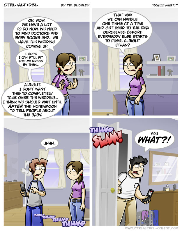 First Previous Random Next Last | 1 Share You are currently browsing the archive for Ctrl Alt Del First Previous Archive Random Next Last | 1 Share Tweet 24 Guess what? February 23, 2008 by Tim Subscribe Notify of new follow-up comments new replies to my comments Label {} [+] Name* Email* Δ Label {} [+] Name* Email* Δ 1 Comment Oldest Newest Most Voted Inline Feedbacks View all comments MidnightDStroyer 7 years ago Well, if there’s anyone that could keep the secret until Ethan & Lilah reveals it first, it would be Lucas. But how are they going to keep the news from Zeke? He’s got Wii (shudder).