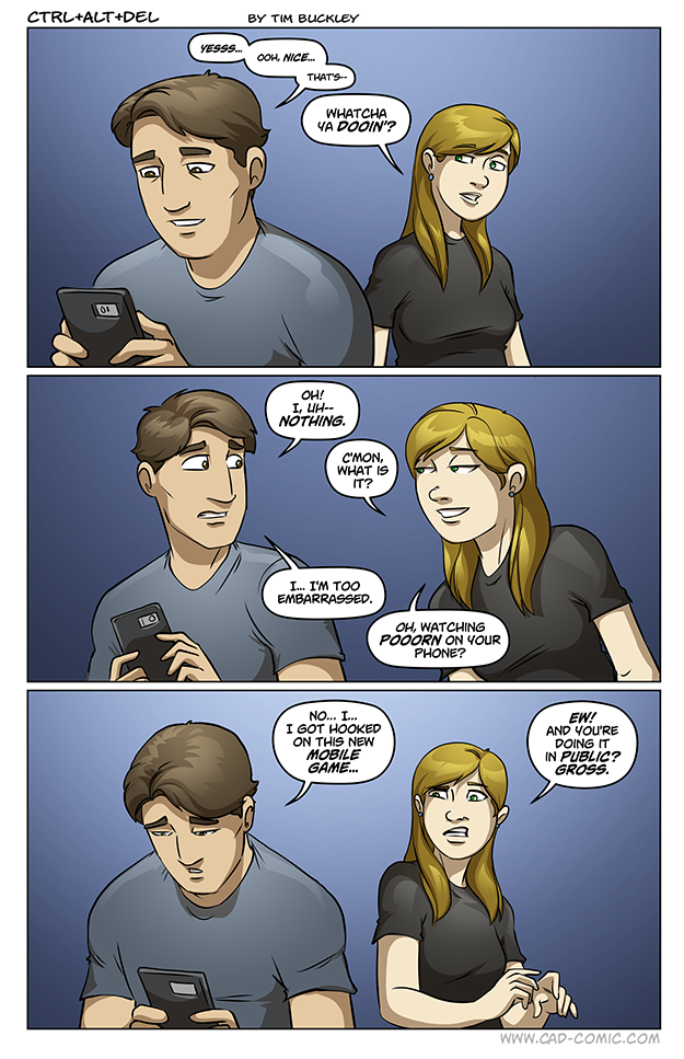 And damn that thing is addictive. With normal games there’s a ceremony of sorts. You try and plan out (cough, family, cough) the time and place to sit down and appreciate the game. But with this thing, you just whip it out anywhere you find yourself having a spare moment and keep poking at… at least I get where the reference to porn comes from in this comic 😉