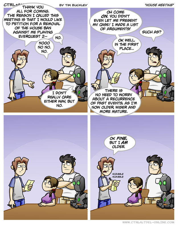 First Previous Random Next Last | 4 Share You are currently browsing the archive for Ctrl Alt Del First Previous Archive Random Next Last | 4 Share Tweet 24 House meeting December 5, 2007 by Tim Subscribe Notify of new follow-up comments new replies to my comments Label {} [+] Name* Email* Δ Label {} [+] Name* Email* Δ 4 Comments Oldest Newest Most Voted Inline Feedbacks View all comments Arceus 7 years ago That’s still a “No” from me, Ethan. Maximum 3 years ago Wtf even is EverQuest? cadfan22 2 years ago It’s woods time for you. Toby 4 months ago the woods