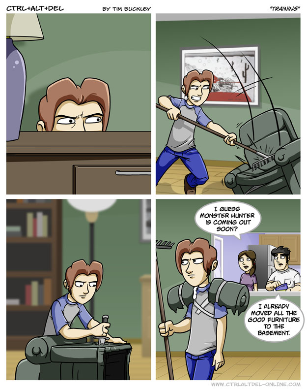 First Previous Random Next Last | 3 Share You are currently browsing the archive for Ctrl Alt Del First Previous Archive Random Next Last | 3 Share Tweet 24 Hunt Training April 9, 2010 by Tim Subscribe Notify of new follow-up comments new replies to my comments Label {} [+] Name* Email* Δ Label {} [+] Name* Email* Δ 3 Comments Oldest Newest Most Voted Inline Feedbacks View all comments Him. 7 years ago Hm, is he a hammer user or a Longsword? Dingle Bloopynoop 5 years ago Reply to Him. sword and shield is the only way to go baby Carbonated 3 years ago A true hunter! He has the entire chair and only takes the armrests