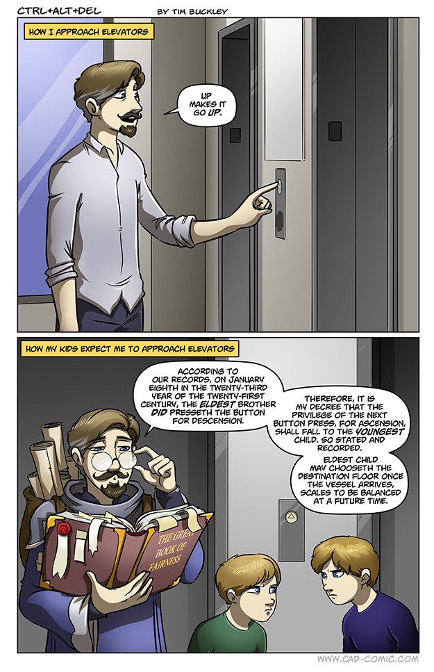 We’re on the same page Tim. I also had a mental version of “The Great Book of Fairness” thrust upon my unsuspecting person by my four daughters. Elevator buttons were only the beginning…